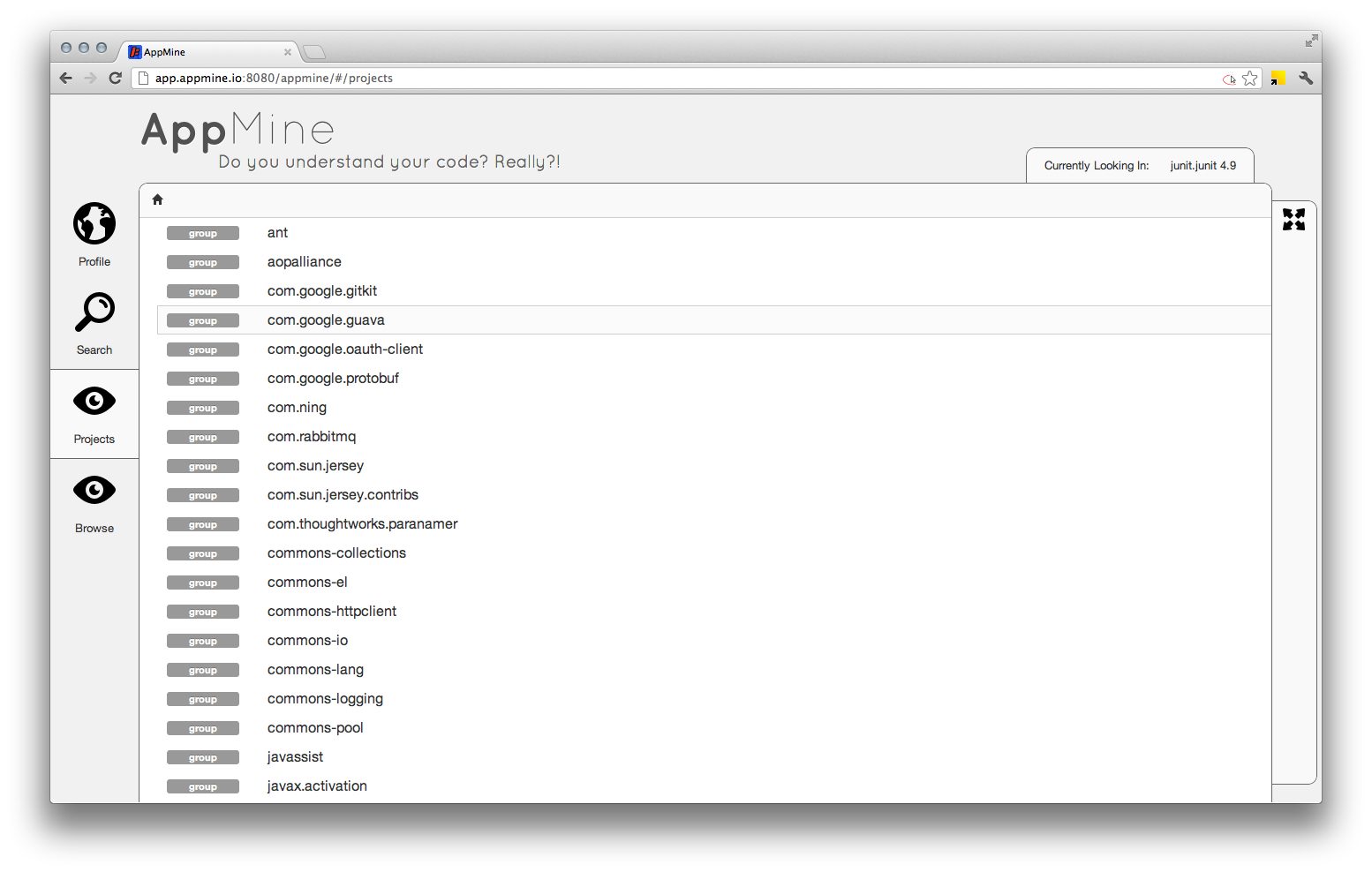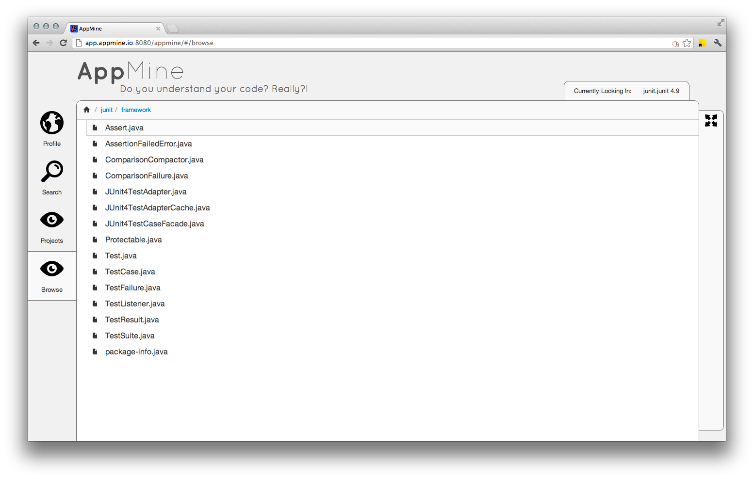Browse all the sources stored in AppMine's repository. Everything is bidirectionally cross-referenced, even across various projects! You can highlight, annotate, comment and collaborate... in realtime!