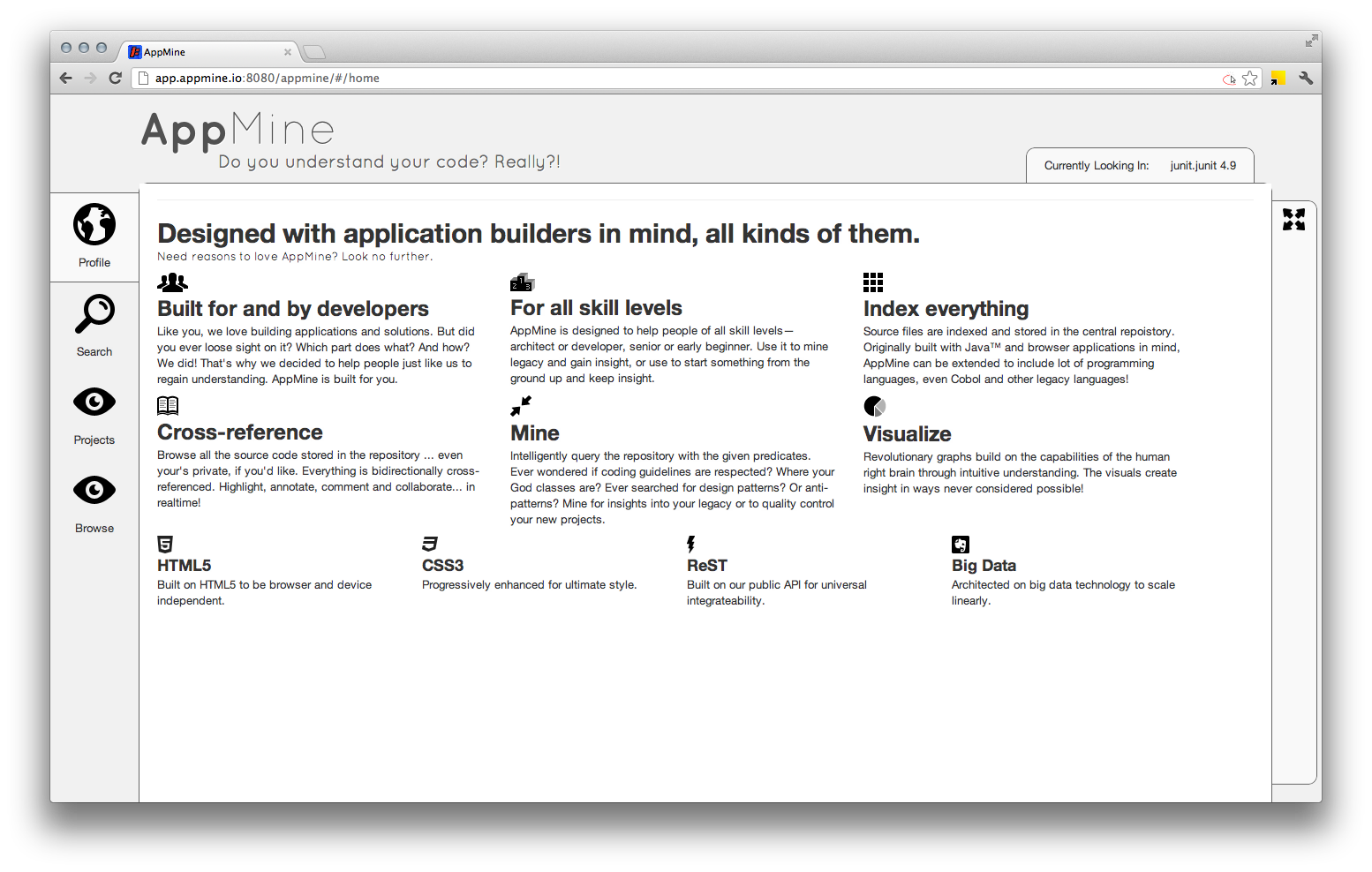 AppMine is designed to help people of all skill levels—architect or developer, senior or early beginner. Use it to mine legacy and gain insight, or use it to start something from the ground up and keep insight.